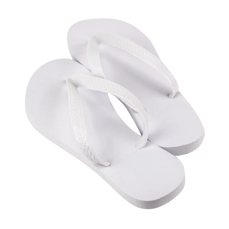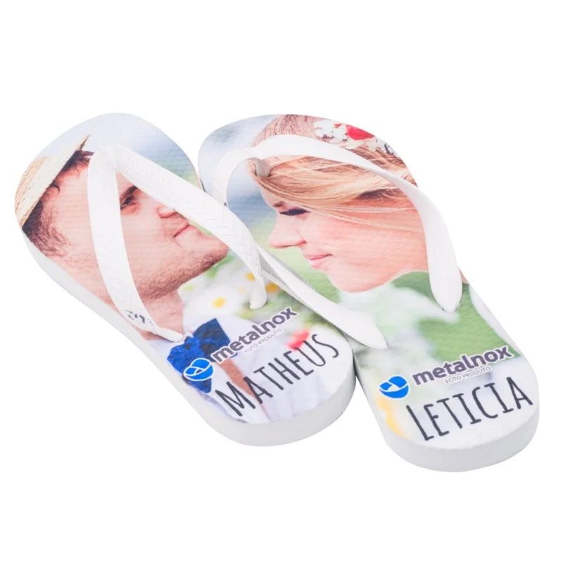 - Revestimento em tecido poliéster: a superfície branca do chinelo é revestida com uma camada de tecido poliéster de alta qualidade. É neste revestimento que a sua personalização é aplicada, permitindo estampas com cores vivas, detalhes nítidos e alta durabilidade, sem desbotar com facilidade.